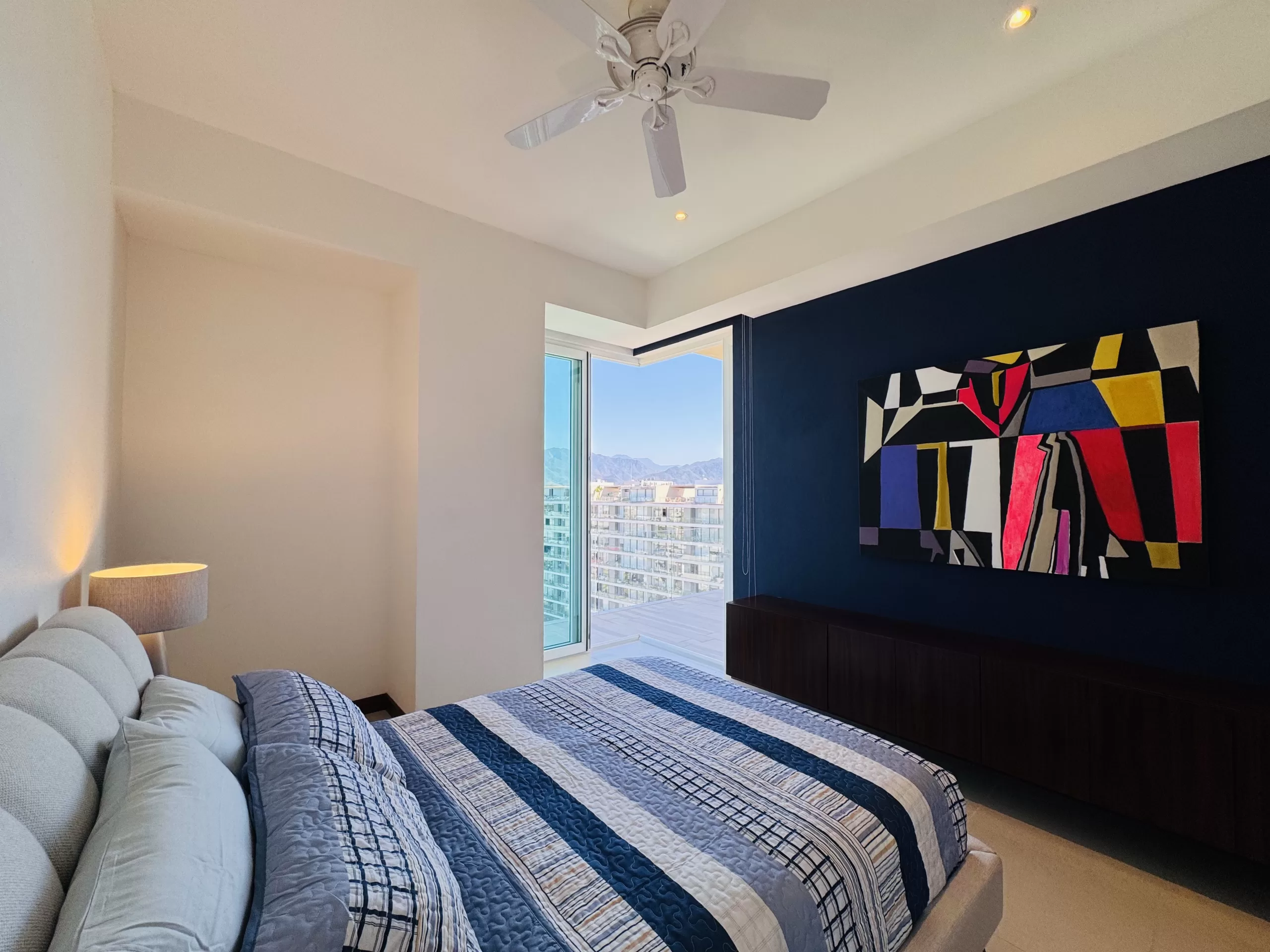 Inside, you’ll find an elegant open-concept living space featuring a fully equipped kitchen, a stylish dining area, and a comfortable living room designed for relaxation and entertainment. Floor-to-ceiling windows flood the space with natural light, enhancing the penthouse’s modern aesthetic.